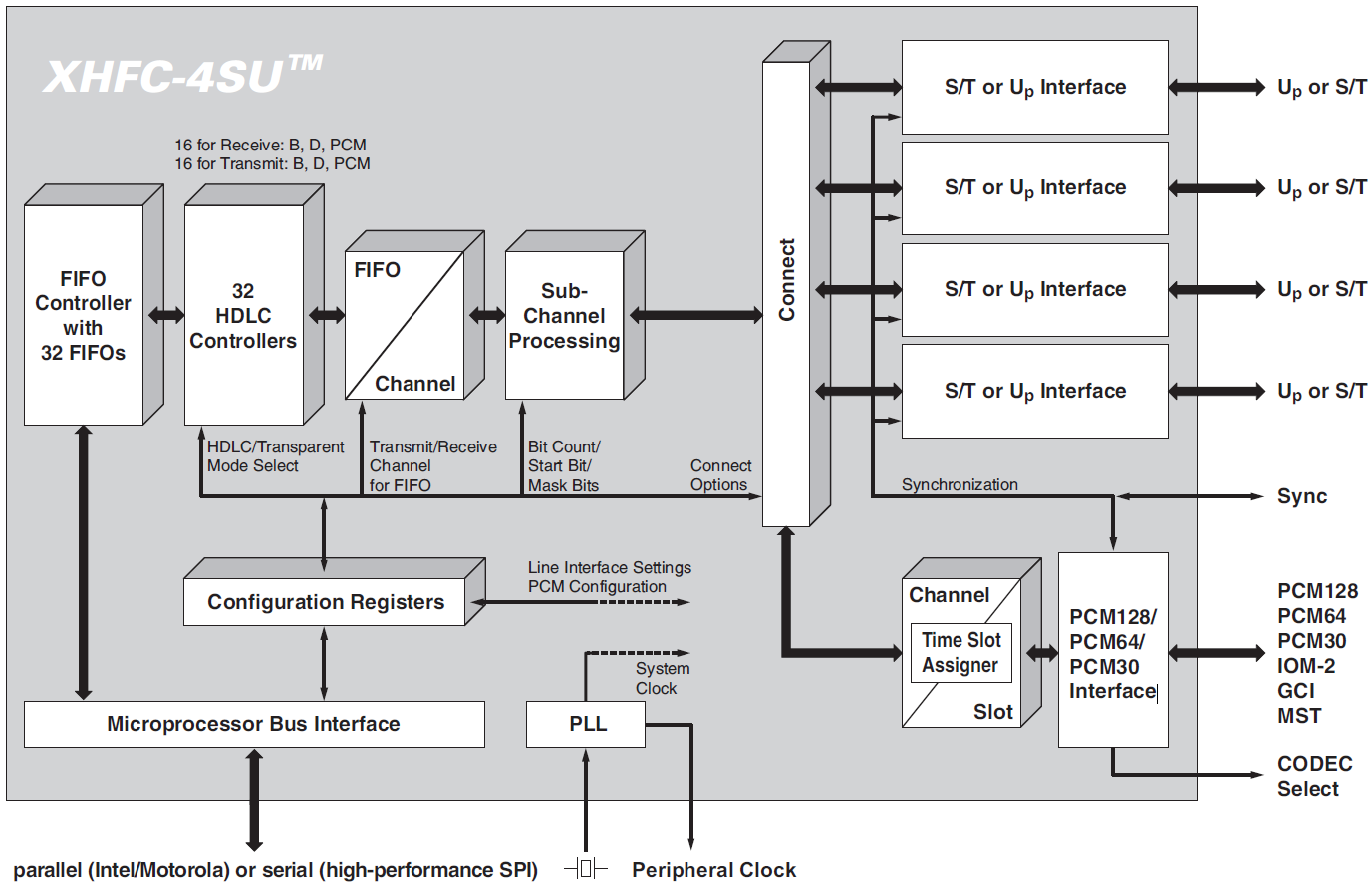 Also implemented is a PCM128 / PCM64 / PCM30 highway interface and an integrated universal external bus interface that can be configured to PCI, ISA Plug and Play, PCMCIA, parallel microprocessor interface or SPI.